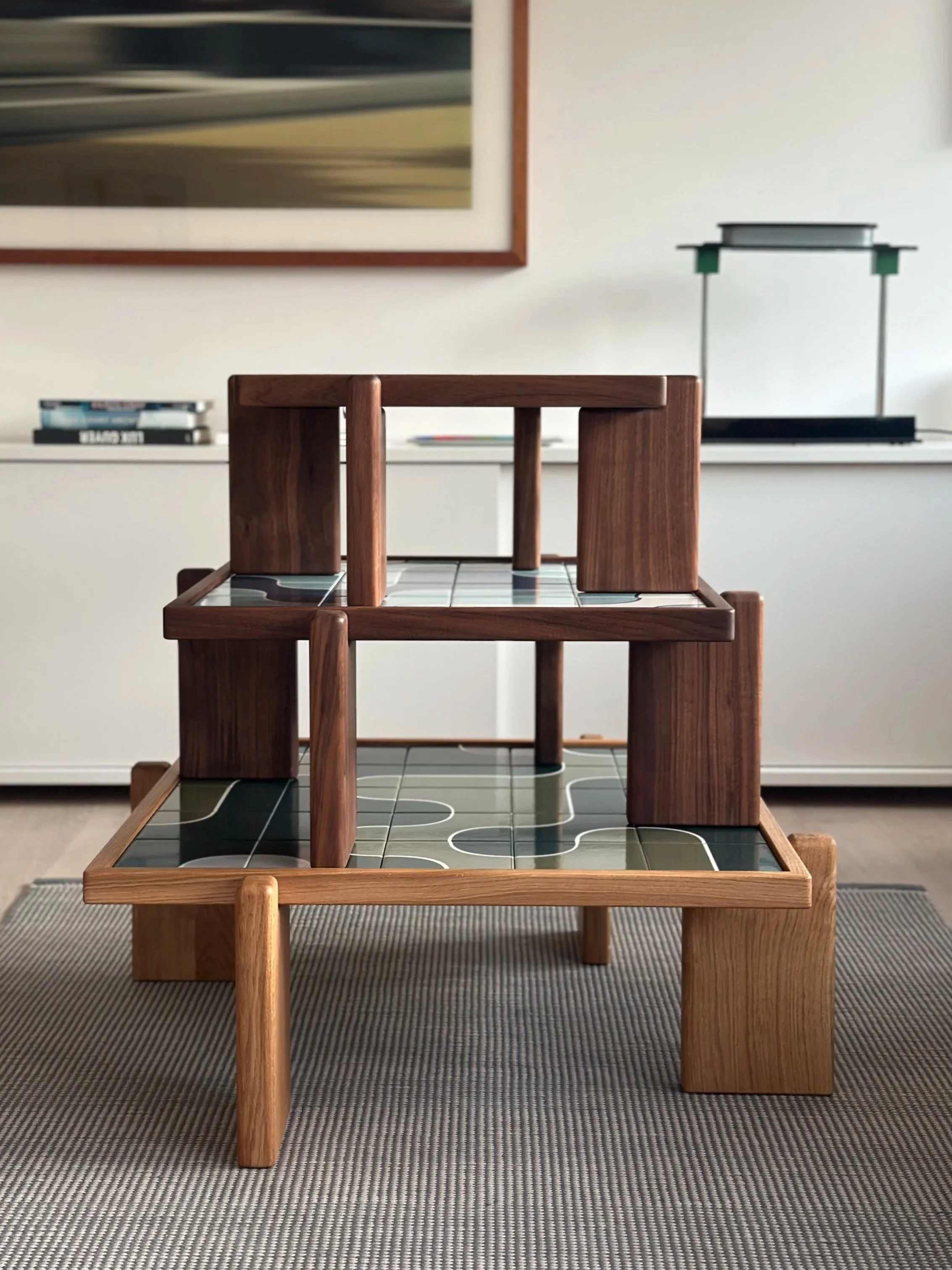 solid wood table with hand-painted ceramic tiles